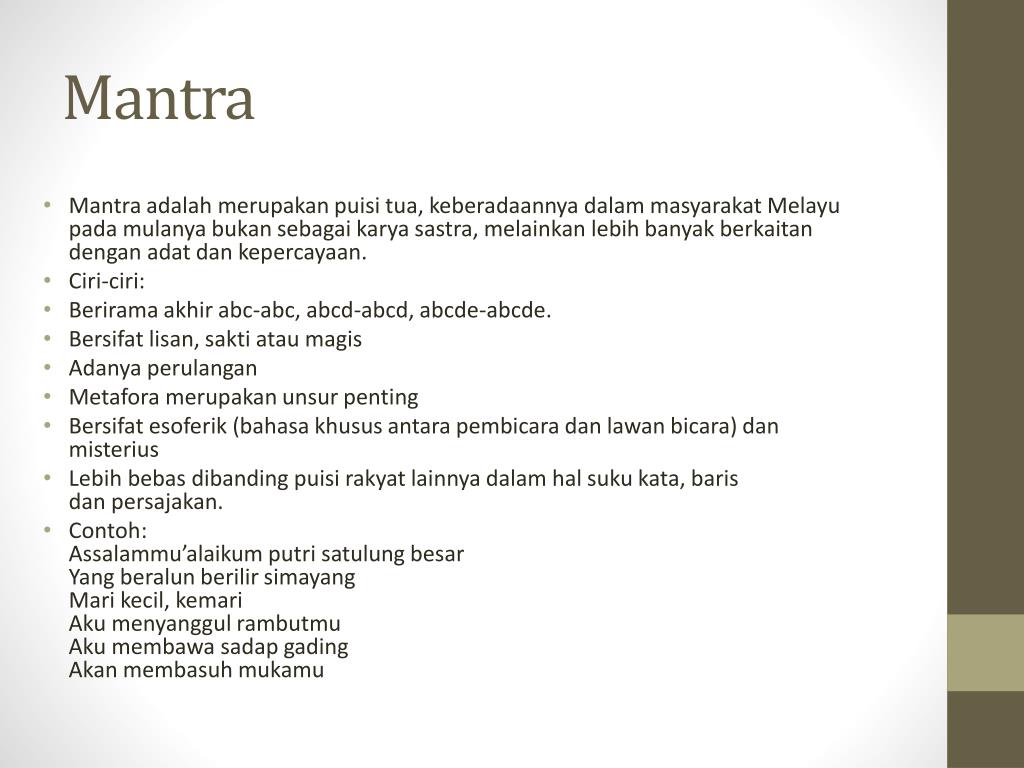 Contoh puisi lama mantra beserta maknanya puisi adalah bentuk karya sastra yang terikat oleh irama, rima dan penyusun bait dan baris yang . Pantun, syair, seloka, karmina, gurindam dan talibun. Semoga bisa menjadi bahan pelajaran dalam menyelesaikan tugas sekolah. Terdiri atas dua larik, yang pada larik pertama disebut sampiran, sedangkan larik kedua disebut isi. Mantra juga termasuk dalam puisi lama/tua, yang pada masyarakat melayu bukan dianggap sebagai sebuah karya sastra, melainkan lebih berhubungan dengan adat . Jenis jenis puisi lama, antara lain: Tidak ada kelebihan khusus untuk mantra. Mari kita bahas secara singkat contoh puisi lama . Pantun, mantra, karmina, seloka, syair, talibun, dan gurindam. Karmina sering disebut sebagai pantun kilat. Contoh seloka nasehat pendidikan mengejek sindiran lengkap . Lima percik mawar tujuh sayap merpati sesayat langit perih. Bisa dikatakan bahwa puisi lama yang .